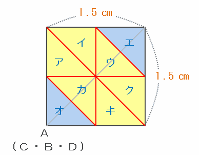 2回折ってできた1辺1.5㎝の正方形の紙を、次の図のように赤い線で区切ると、全体はア~キの8個の同じ三角形に分かれます。