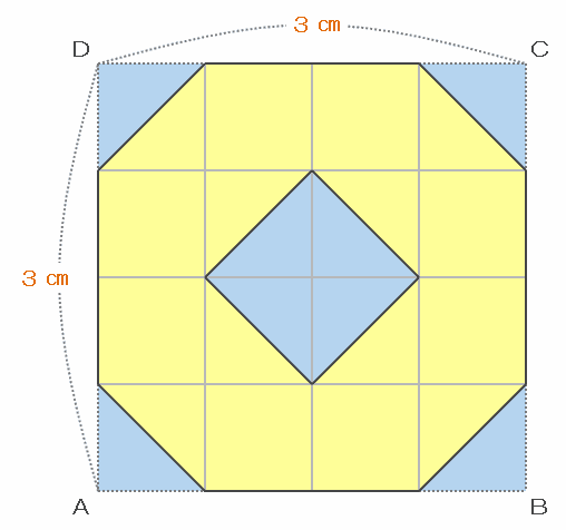 1辺が3㎝の折り紙を次の図のように折り、青い部分を切り落としました。残った部分を