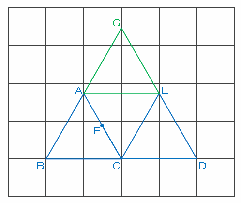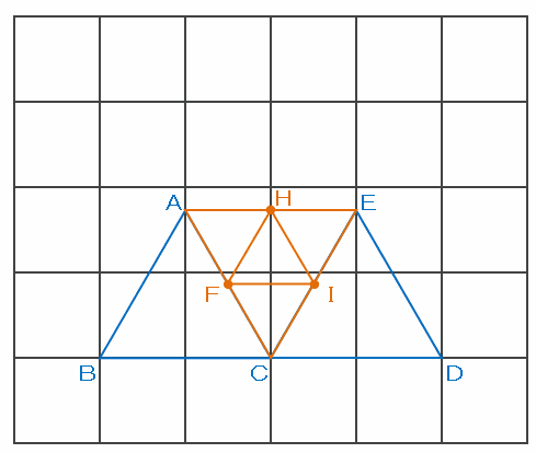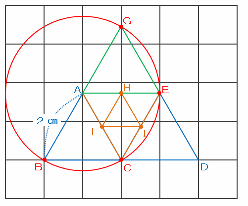 図のように、1㎝の方眼の上に正三角形ABC、正三角形ECDがあります。その正三角形の1辺の長さはともに2㎝で、Fは辺ACを2等分する点です。この方眼の上に、3つの点G、H、Iを三角形GBD、HAF、IFCがどれも正三角形になるようにとります。ただし、点HとIは正三角形ABCの辺上にはとらないものとします。