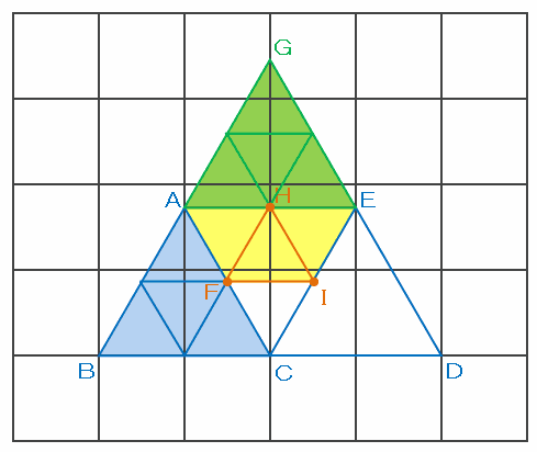 次の図を見れば分かるように、正三角形ABCの面積は小さい正三角形4個分、そして五角形AFIEGの面積は小さい正三角形が緑色4個と黄色3個で合わせて7個分になっています。