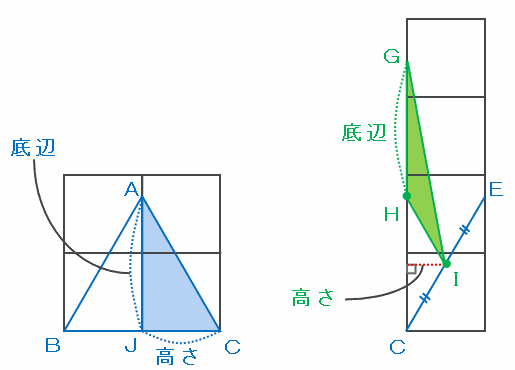 次の2つの図を利用して、青い三角形AJCと緑色の三角形GHIを比べてみると、