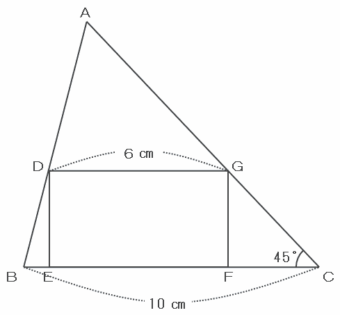 次の図のように、面積が40㎠の三角形ABCの辺の上に4つの点D、E、F、Gがあり、DEFGは長方形、角Cは45度、BC=10㎝、DG=6㎝です。このとき、三角形ADGの面積は( )㎠、三角形DBEの面積は( )㎠です。