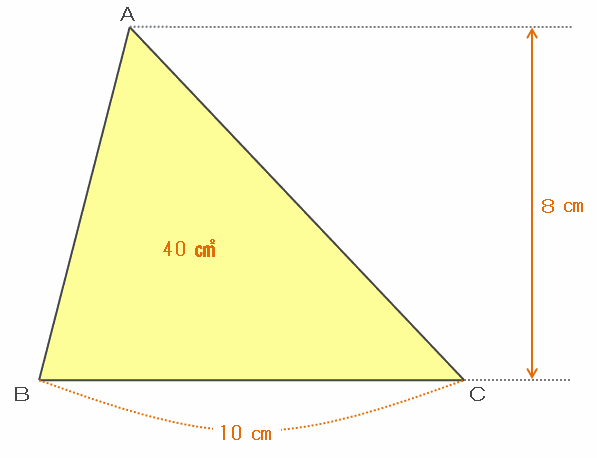 次の図の三角形ABCは底辺が10㎝で面積が40㎠なので、高さは40×2÷10=8㎝になります。