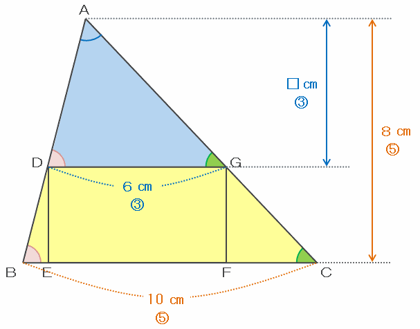 このとき、上の図の2つの三角形の高さの比も3:5となるので、三角形ADGの高さを□㎝とおくと、3:5=□㎝:8㎝という比例式ができます。