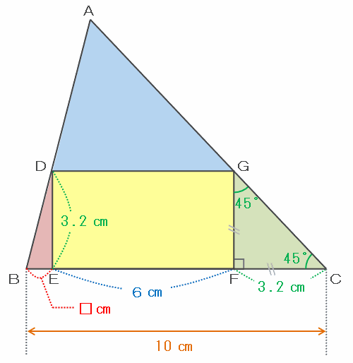 次の図の辺FCの長さは3.2㎝、そしてDEFGは長方形なので、辺EFの長さはDGと同じく6㎝です。