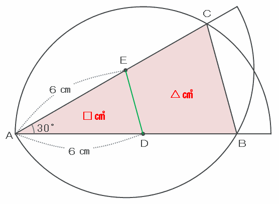 また、辺DEとかBCの長さは結局最後まで分からないのですが、「円の中心から円周上までの直線距離は常に6㎝」となることを最大限に利用しつつ、角度の関係にも注目しながら解けばなんとかなります。