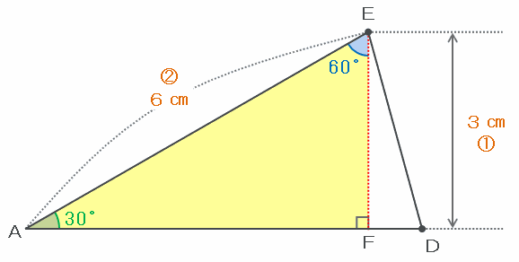 次の図のように、三角形AEDの頂点Eから辺ADに向けて垂線を引き、交点をFとすると、直角三角形AEFができます。