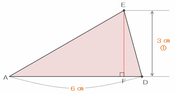 つまり次の図のように、三角形AEDは底辺ADが6㎝、高さEFが3㎝なので、その面積は6×3÷2=9㎠になります。