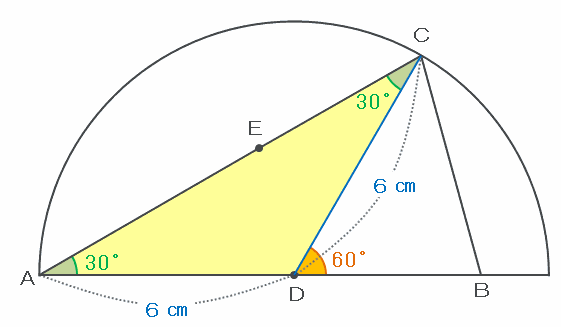 次の図のように、半円の中心Dから円周上の点Cまで補助線を引くと、辺CDは半円の半径になるので、その長さは辺ADと同じく6㎝になります。