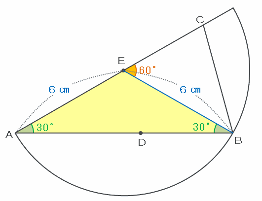 次の図のように、半円の中心Eから円周上の点Bまで補助線を引くと、三角形EABは辺EAとEBの長さがどちらも6㎝で等しい二等辺三角形になります。