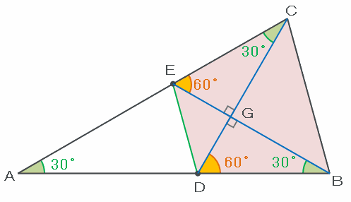 また、三角形CEGとBDGはどちらも3つの内角の組み合わせが「30度・60度・90度」の直角三角形なので、青い2本の対角線は直角に交わっていることが分かります。