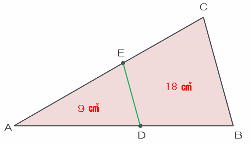 これまでに分かったことをまとめると、次の図の三角形ADEの面積は9㎠、そして台形DBCEの面積は18㎠なので、三角形ABCの面積は9+18=27㎠になります。