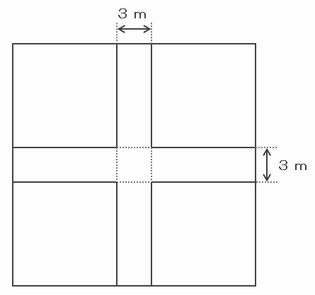 次の図のような大きな正方形の土地に3mの幅の道路を作って、同じ4つの小さな正方形の土地に区分けしました。道路の面積が117㎡であるとき、もとの大きな正方形の土地の面積は何㎡ですか。
