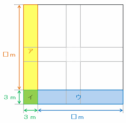 さっき左端へ寄せた黄色い長方形アを、次の図のように左下へパタンと倒してみると、アイウはたて3mの細長い長方形になります。