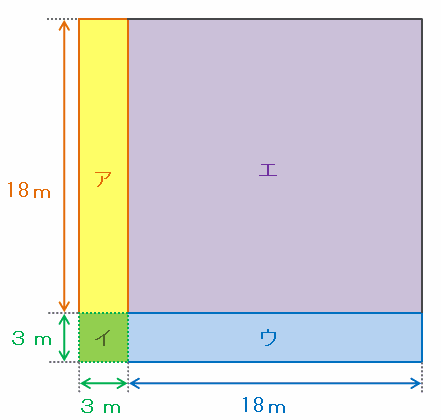 上の図の細長い長方形アイウは横の長さが39m、そしてイの部分は横の長さが3mなので、アとウの横の長さはどちらも(39-3)÷2=18mです。