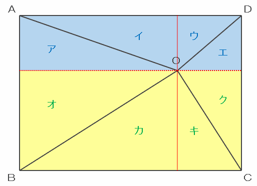 次の図のように、辺ADとABに平行で点Oを通る赤い線を引いてみると、長方形ABCDはア~クの8個の直角三角形に分けられます。