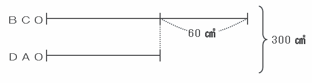 三角形BCOと三角形DAOの面積の合計(さっきの図のイ+ウ+カ+キ)は300㎠、そして三角形BCOの面積はDAOよりも60㎠大きいので、次のような和差算の線分図を利用することができます。