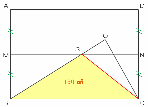 長方形ABCDの面積は600㎠、長方形MBCNの面積は600÷2=300㎠なので、三角形SBCの面積は300÷2=150㎠になります。