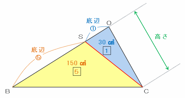 三角形SCOとSBCの面積比は30㎠:150㎠=1:5なので、OSとSBの長さの比も1:5になります。