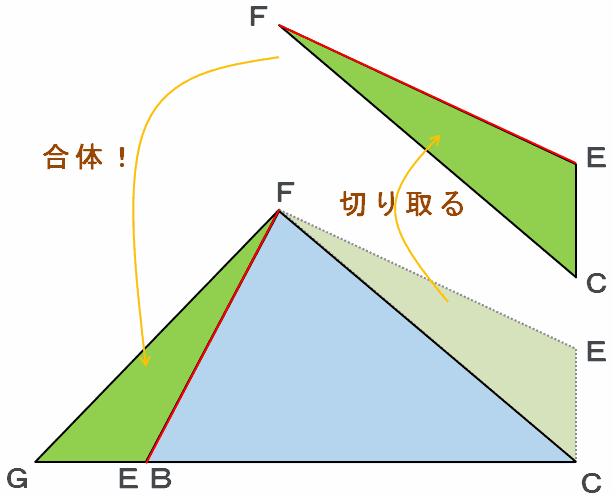 まずは次の図のように三角形FCEを切り取り、FEとFBが重なるようにしてくっつけて、三角形FGCを作ります。