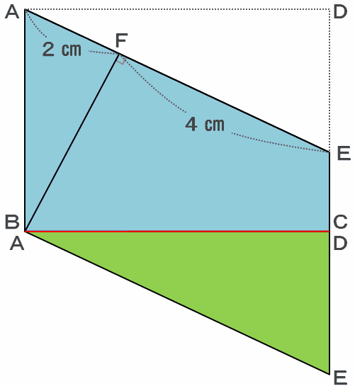 まずは三角形AEDを切り取り、それを次の図のように辺ADと辺BCが重なるようにくっつけると、底辺が2+4=6㎝の平行四辺形ができます。