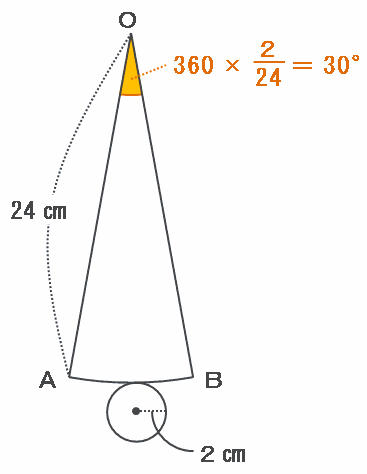 この円すいの展開図は、次のように「側面=半径24㎝のおうぎ形OAB」と「底面=半径2㎝の円」の2つからできています。