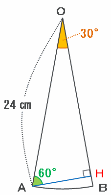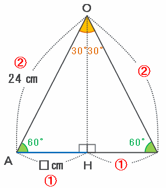 このとき、上の図の辺AHの長さは辺OAの半分なので、答えは24÷2=12㎝になります。