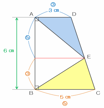 三角形AEDとEBCの底辺の長さの比は3㎝:5㎝=3:5なので、その2つの三角形の面積を等しくするには、次の図のように高さの比を底辺の比の逆比である5:3にすればOKです。