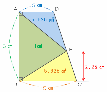次の図の三角形EBCの面積は5×2.25÷2=5.625㎠、そして三角形AEDの面積もそれと同じく5.625㎠なので、三角形AEDとEBCの面積の合計は5.625×2=11.25㎠です。