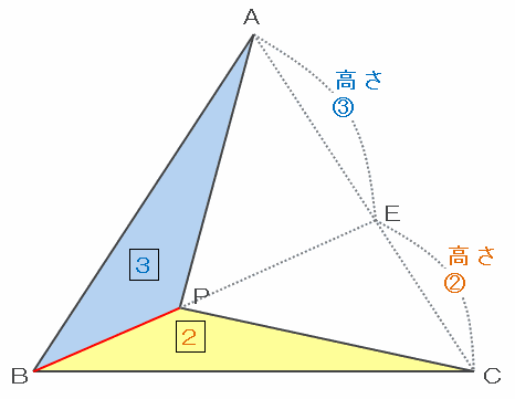 次の図の三角形PABとPBCは、底辺をどちらもBPとすると高さの比がAE:EC=3:2なので、面積比もPAB:PBC=3:2と表せます。