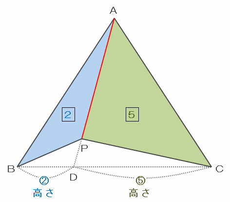 次の図の三角形PABとPCAは、底辺をどちらもAPとすると高さの比がBD:DC=2:5なので、面積比もPAB:PCA=2:5と表せます。