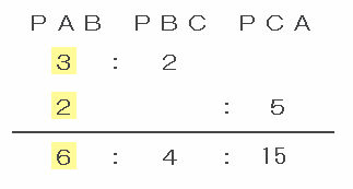 となるので、三角形PABとPBCとPCAの面積比は6:4:15となります。