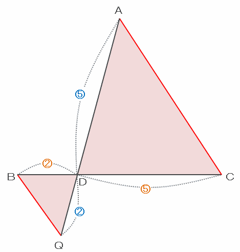 この図の辺BDとDCの長さの比は2:5なので、辺DQとADの長さの比も2:5になります。
