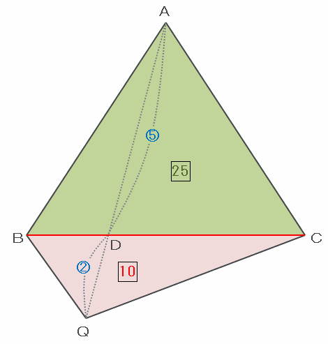 次の図の三角形ABCとQBCは、底辺をどちらもBCとすると、高さの比がAD:DQ=5:2なので、面積比もABC:QBC=5:2と表せます。