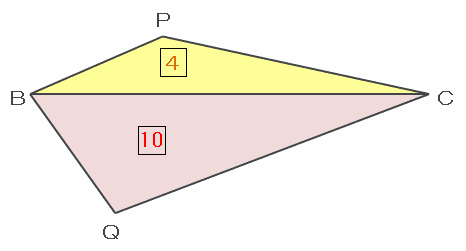 また、三角形PBCの面積は比の4、QBCの面積は比の10と表せるので、四角形PBQCの面積は比の4+10=14となります。