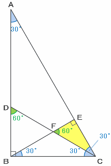 つまり、上の図の三角形ABC、DBC、EFCの3つは、どれも内角が30度、60度、90度の直角三角形になっています。
