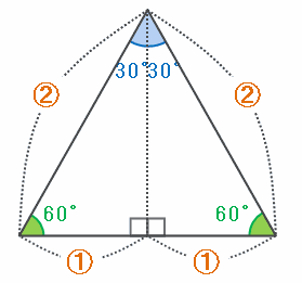 そのような内角の直角三角形は、次の図のように正三角形を縦にスパッと切断してできる形なので、三角形の一番長い辺と一番短い辺の長さの比は2:1になります。