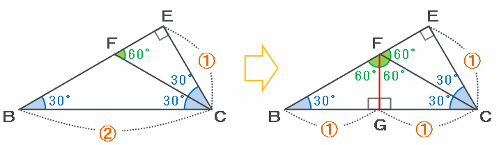 下の図の三角形EBCとEFCは、3つの内角が30度、60度、90度の直角三角形、そして三角形FBCは辺FB=辺FCの二等辺三角形になっています。