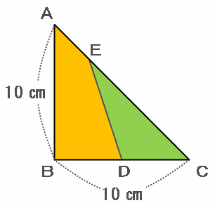 紙を1回目に折り曲げたときにたての長さが半分に、そして2回目に折り曲げたときには横の長さが半分になったので、下の図の三角形ABCの底辺と高さはどちらも20÷2=10㎝になっています。