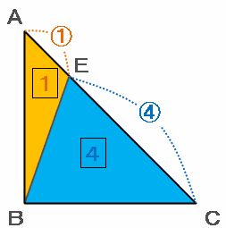 下の図のオレンジ色の三角形ABEと青い三角形EBCは、辺AEと辺ECの長さの比が1:4になっています。