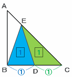また、青い三角形EBDと緑色の三角形EDCは高さが等しいので、面積比は底辺の比と同じく1:1になっています。