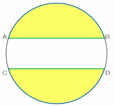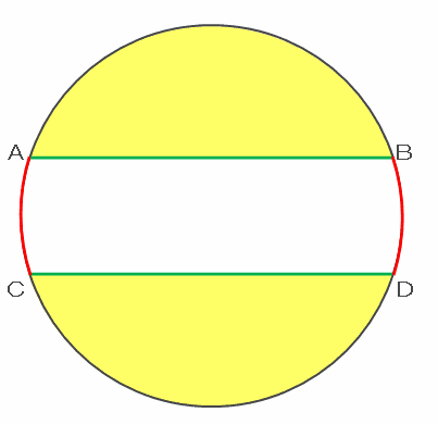 次の図のように、半径6㎝の円周上に4点A、B、C、Dがあります。ABとCDは長さが等しくて平行です。黄色い部分2か所の周の和が白い部分の周より、円周の長さの3分の2だけ長いとき、黄色い部分2か所の面積の和を求めなさい。