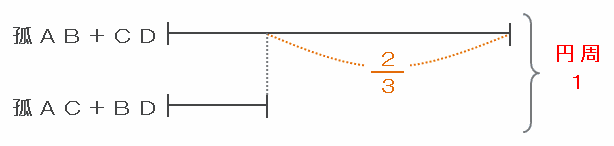 また、周りの長さの差は円周の3分の2にあたるので、円周の長さを1とおいて「青い孤AB+CD」と「赤い孤AC+BD」の長さの関係を次のような線分図に表すと、