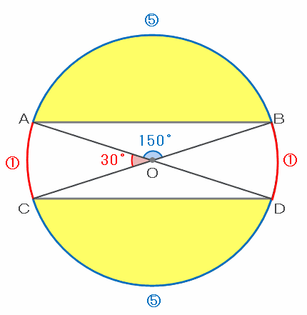 次の図の孤ABと孤ACの長さは5:1なので、おうぎ形OABの中心角は180×6分の5=150度、おうぎ形OACの中心角は180×6分の1=30度になります。