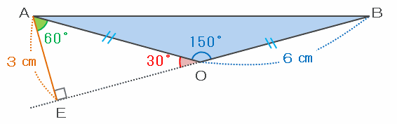 つまり、三角形AEOは3つの内角の組み合わせが「30度・60度・90度」となるので、ちょうど正三角形を縦にスパッと二等分した形となり、辺AEの長さはOAの長さの半分にあたる6÷2=3㎝であることが分かります。