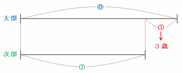 次のように、太郎君の年齢を⑧、次郎君の年齢を⑦とおいて線分図に表してみると、その差である⑧-⑦=①が、2人の年齢差である3歳にあたります。
