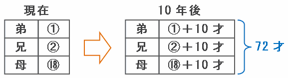 今から10年後、この3人はそれぞれ10才ずつ年をとる(たまに年が増えないお母さんもいる)ので、次の図のように弟の年齢は1+10才、兄の年齢は2+10才、そして母親の年齢は6+10才となります。