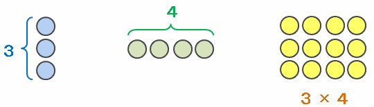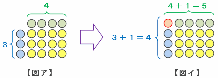 そこで、図イのように左上に○を1個付け足してやると、たての○は3+1=4個、横の○は4+1=5個となるので、長方形全体の○は4×5=20個になります。