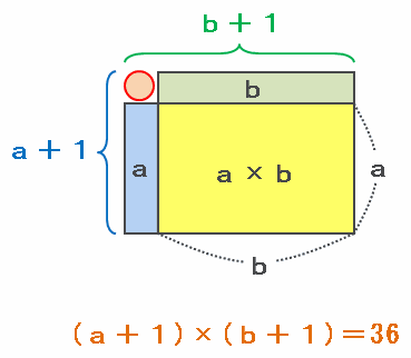 すると、たての長さは「a+1」、横の長さは「b+1」となるので、長方形の面積を求める式は(a+1)×(b+1)と表せます。