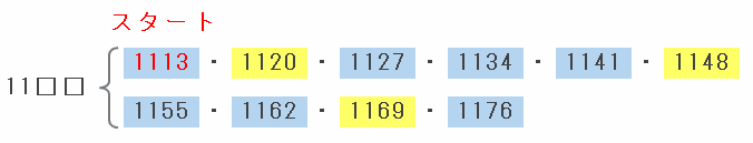 最初に「1113」から数え始めたので、下2けたが同じように「□□13」となるまで数えて、そこまですべて7個ずつであることが確認できればOKです。